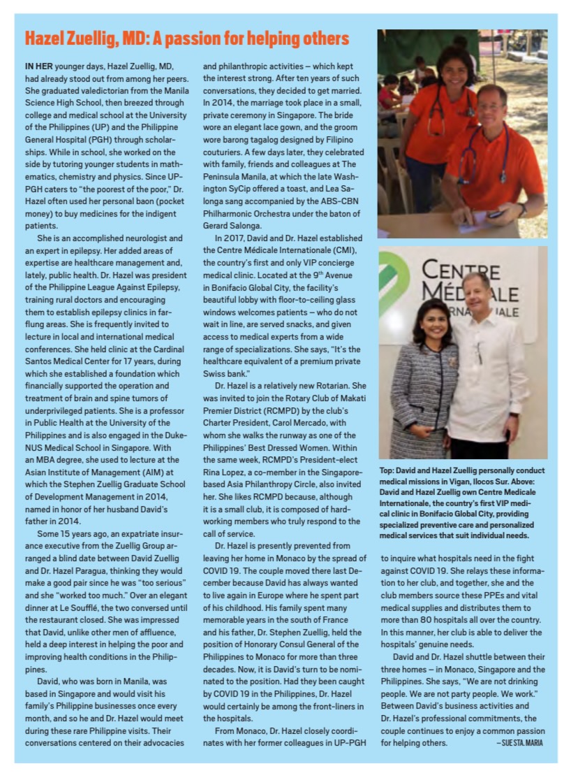 While based in Asia, the couple was actively engaged in different philanthropic projects in relation to the Zuellig Family Foundation (Philippines), Asia Philanthropy Circle (Singapore), Rotary Club of Makati Premier District. Philippine Cancer Society, Philippine League Against Epilepsy, Philippine Alliance for Brain and Spine Tumors, Let’s Save the Brain Foundation and the University of the Philippines.